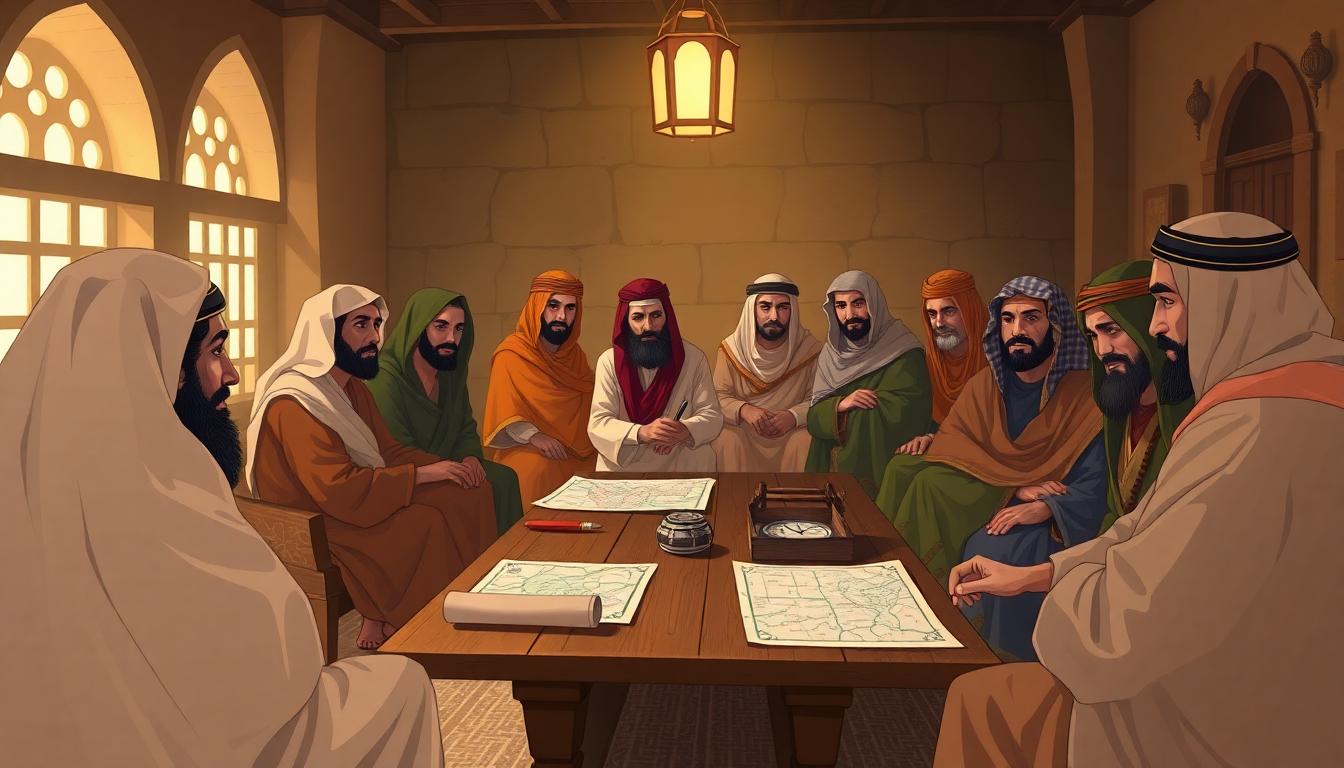 The atmosphere of early Islamic political practice is vividly depicted in this Medina council hall illustration, where diverse voices come together to face real challenges.